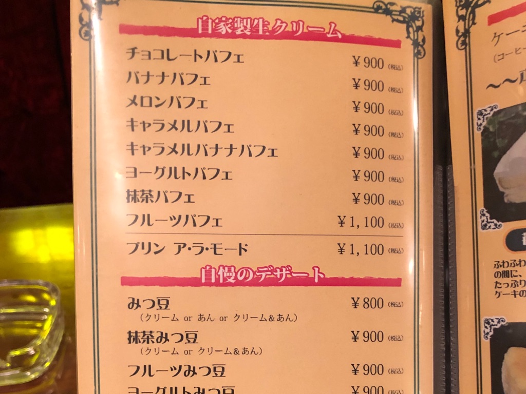 スイーツメニューはこんな感じで、パフェは900円、みつ豆は800円。