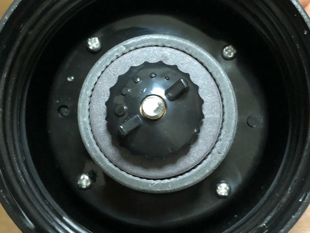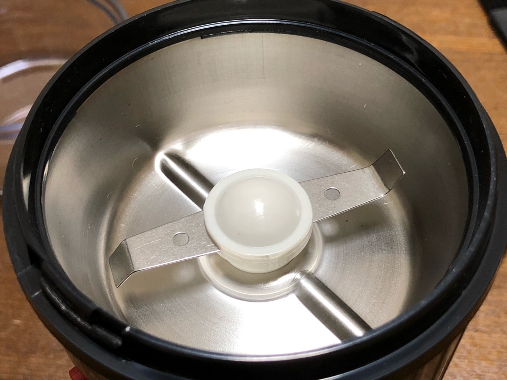 カップの中に凸部分があり、豆がこれで跳ね、均一に挽くことができるという特徴があるのですが、お値段も安い分、構造が単純。