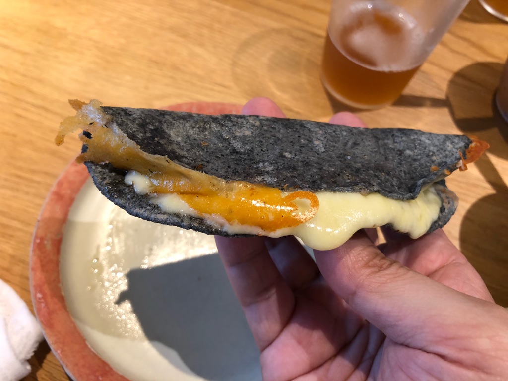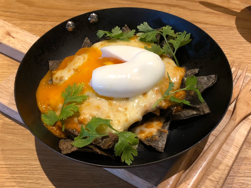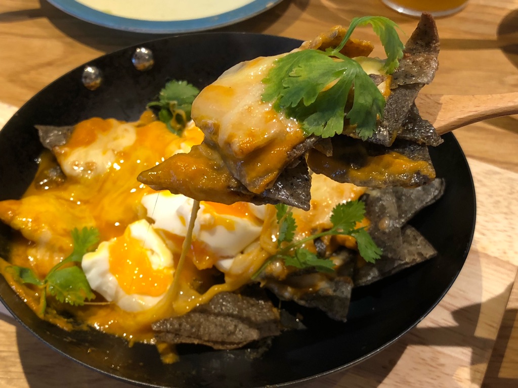 トルティーヤのサクサク感が、チーズとソース、半熟玉子でしっとりしていく過程が楽しく、これ、お酒が進むぞ……。