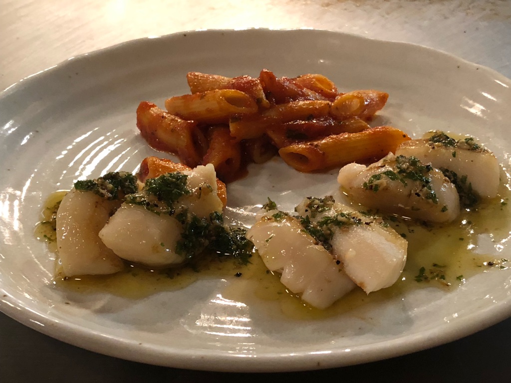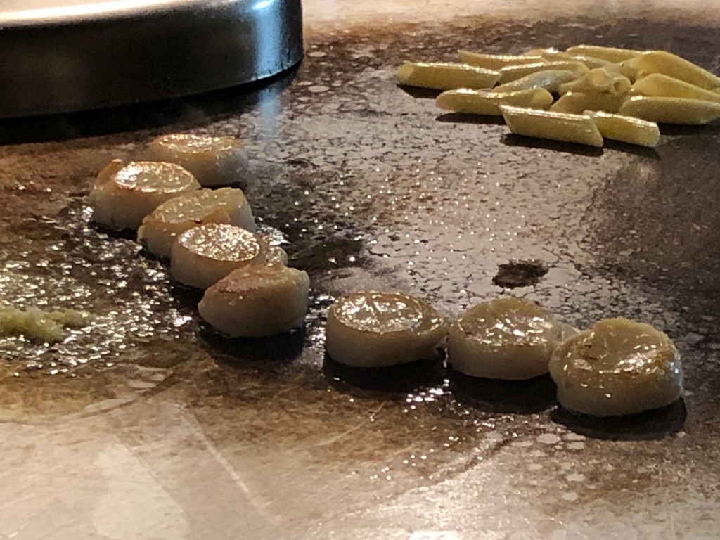 仕上がりはこんなビジュアル。添えられたペンネのミートソースのみならず、貝柱にかかっているバジルソースも鉄板で仕上げられています。