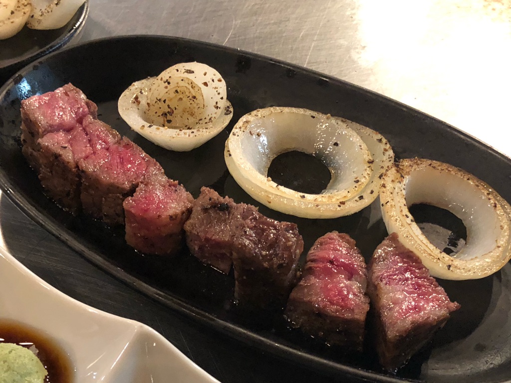 鉄板の低温部分でじっくりと焼かれたサイコロステーキの断面は、豚ソテーを褒めた直後になんですが、肉の王様だな!!とガッツポーズしてしまうそそる色合い。