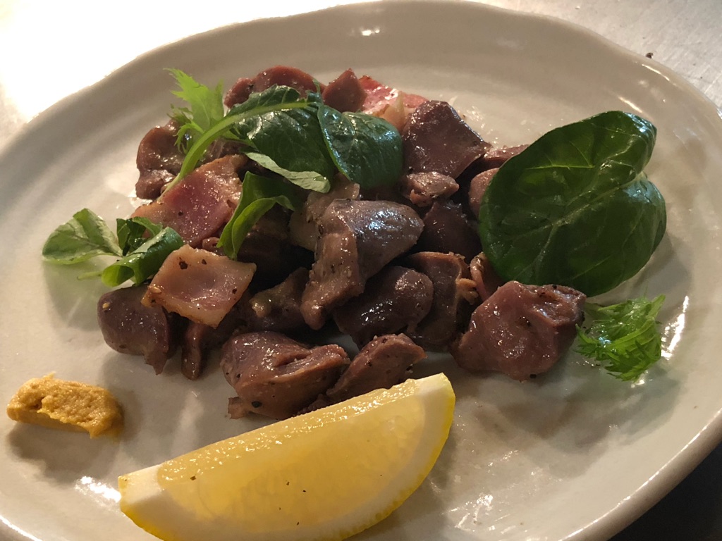 何が言いたいかと言うと、そろそろ〆に……という胃の具合だったのに、小上がり席にいたグループ客のために作られた「砂肝ベーコン」を見て、つい「それ、こっちにも……」と追加してしまった。