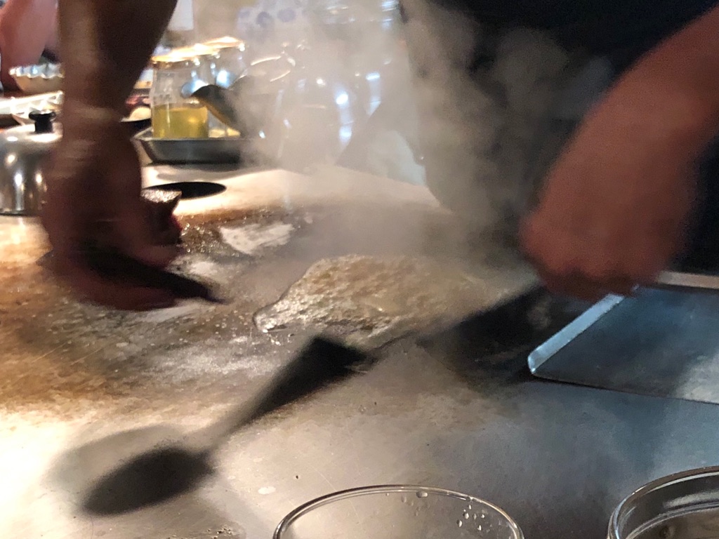 たるやの円形鉄板。そのかぶりつき席に座ると、大将の鉄板さばきをじっくり見られる楽しみがある反面、「それ、他の客の食い物かよ!」と怒りたくなる瞬間があります。