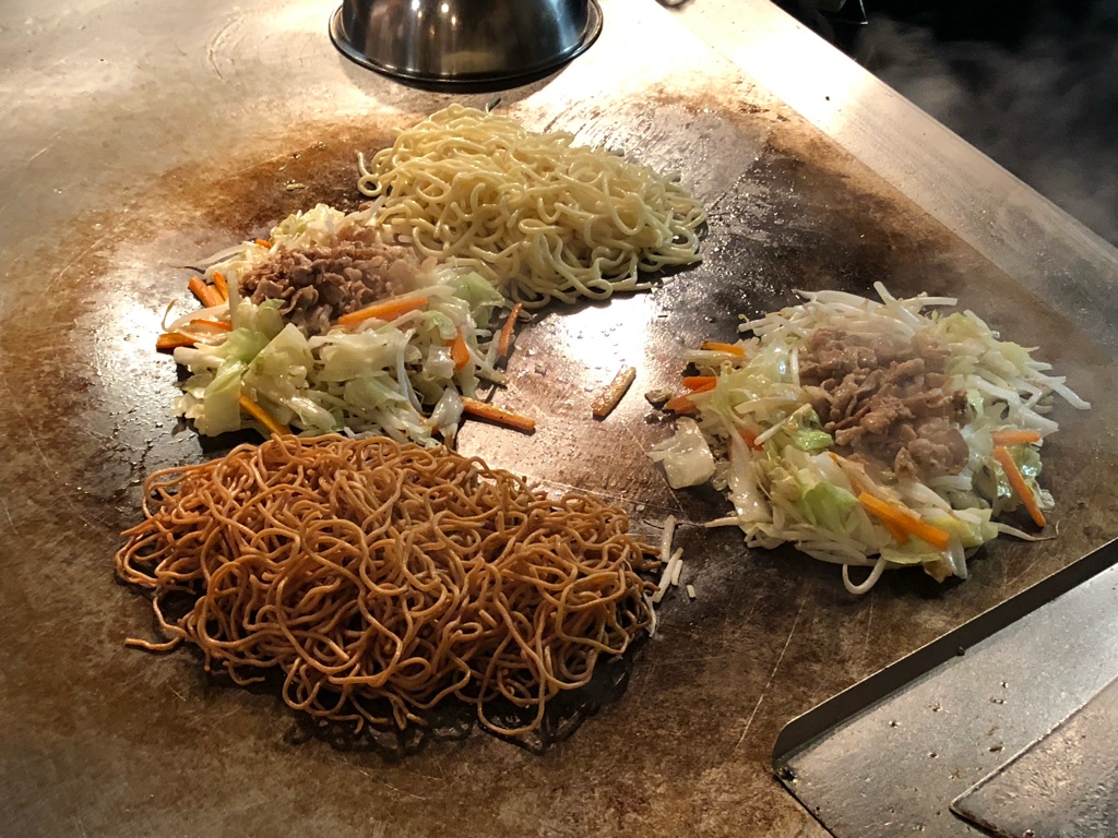 鉄板でじっくり焼かれた麺は、パリパリ食感に仕上がっており、具と麺がバランスよく混ざっているのにかた焼きそばの雰囲気もあります。このパリパリ感、細麺、意外といい……。