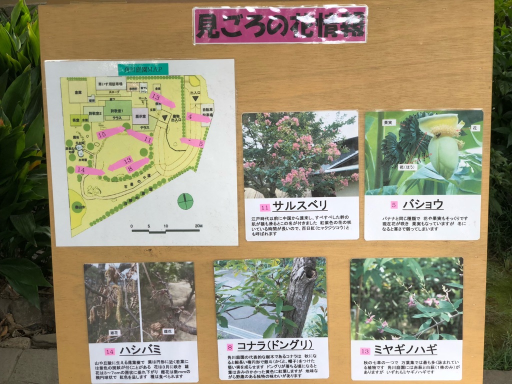 広い庭園に咲く花もしっかり管理され、季節の見頃の案内も出ています。