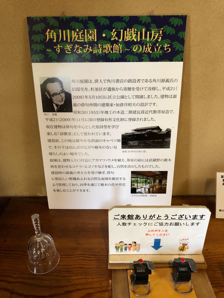 「すぎなみ詩歌館」は、平成17年に角川源義氏のご遺族からこの邸宅を杉並区に寄贈され、平成21年に開園したもので、国の有形文化財にも指定されているんですよ。