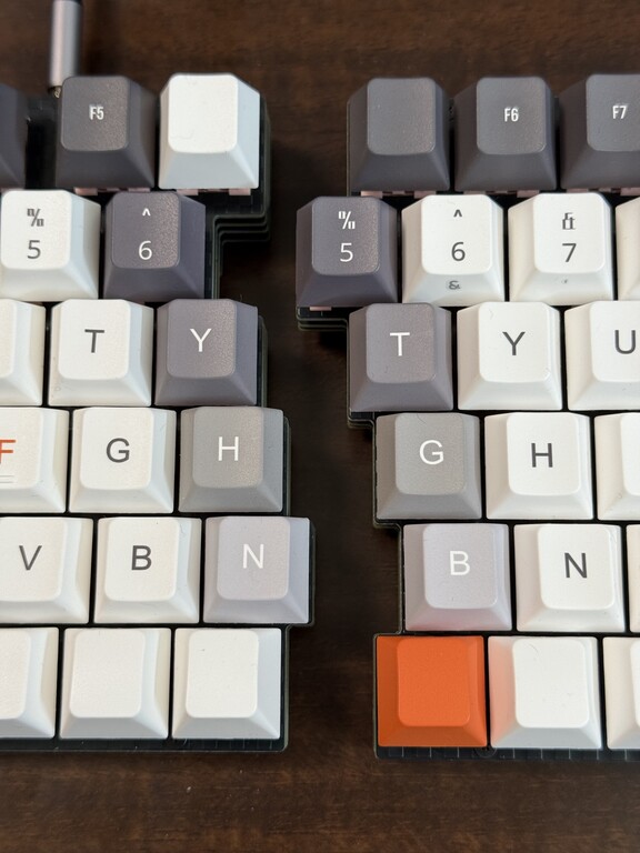 というのも、この自己流ブラインドタッチに対して優しいはずのオーバーラップレイアウトが、 僕はメーカー製分割キーボードにある程度慣れていたせいで、左右に一列ずつ余計なキーがあるために、一瞬視認したときに戸惑ってしまう。