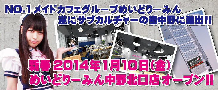 2013年12月27日12:00 No1メイドカフェチェーン「めいどりーみん」2014年1月 サブカルのメッカ中野に殴り込み出店! カテゴリ▶ ニュース 中野 mixiチェック ((株)ネオディライト社長ブログより画像転載)秋葉原の覇権メイドカフェ「めいどりーみん」が新宿に出来た時も驚きましたが、とうとうやって来ました!めいどりーみん中野北口店 2014年1月10日オープン!! 続きを読む▶
